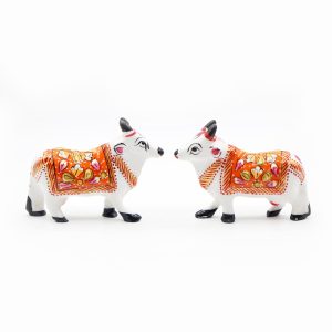 This fibre idol features holy cow with intricate embossing on the body. This idol is made by the traditional artisans with beautiful impressions of ornaments and bell on its neck. Cows are revered as an embodiment of the sacred Kamadhenu cow, Who is known to fulfill all desires. You can place this Idol in place of business or dwelling for attracting prosperity and serenity.