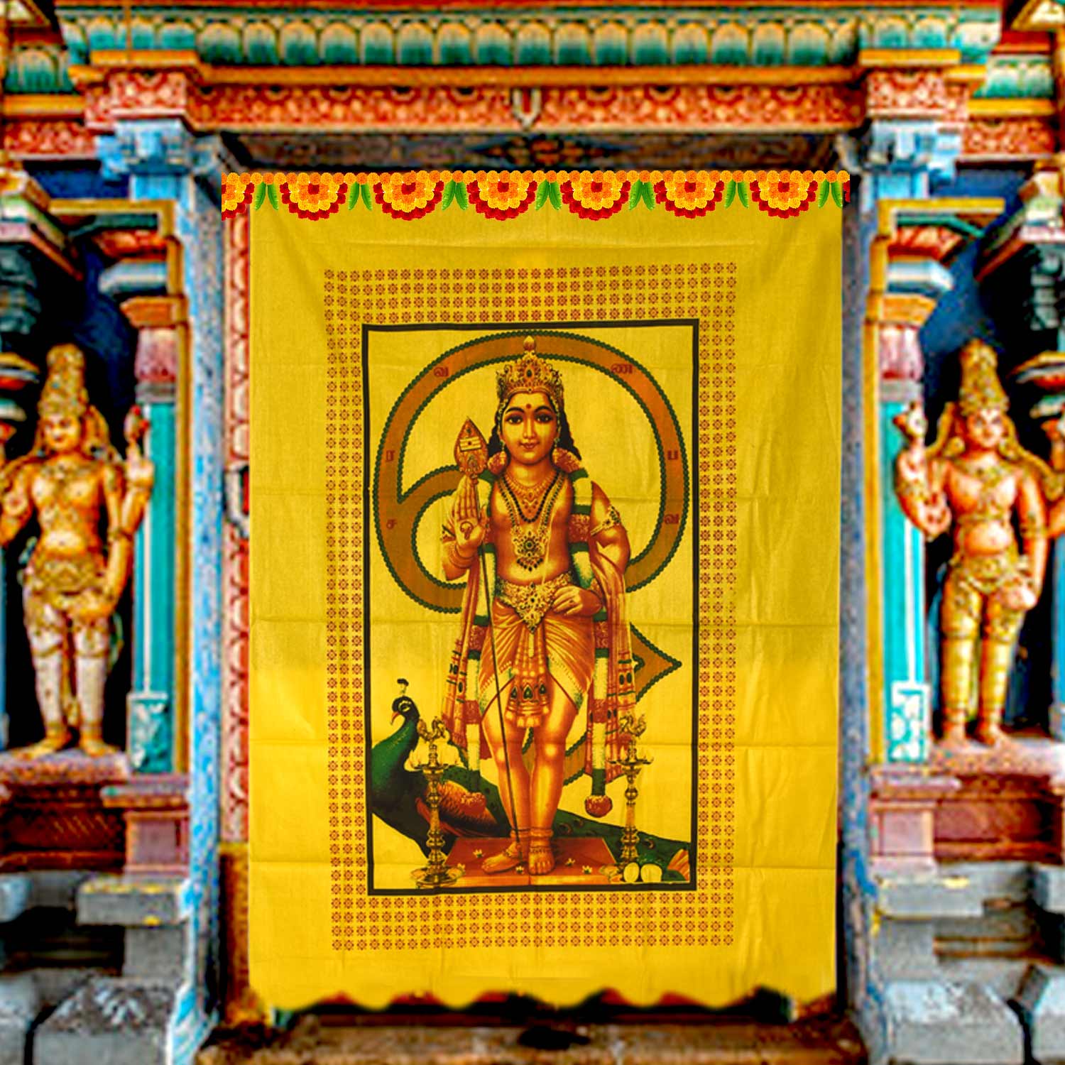 The Temple screen beautifully printed Lord Kartikeya in multiple colors.