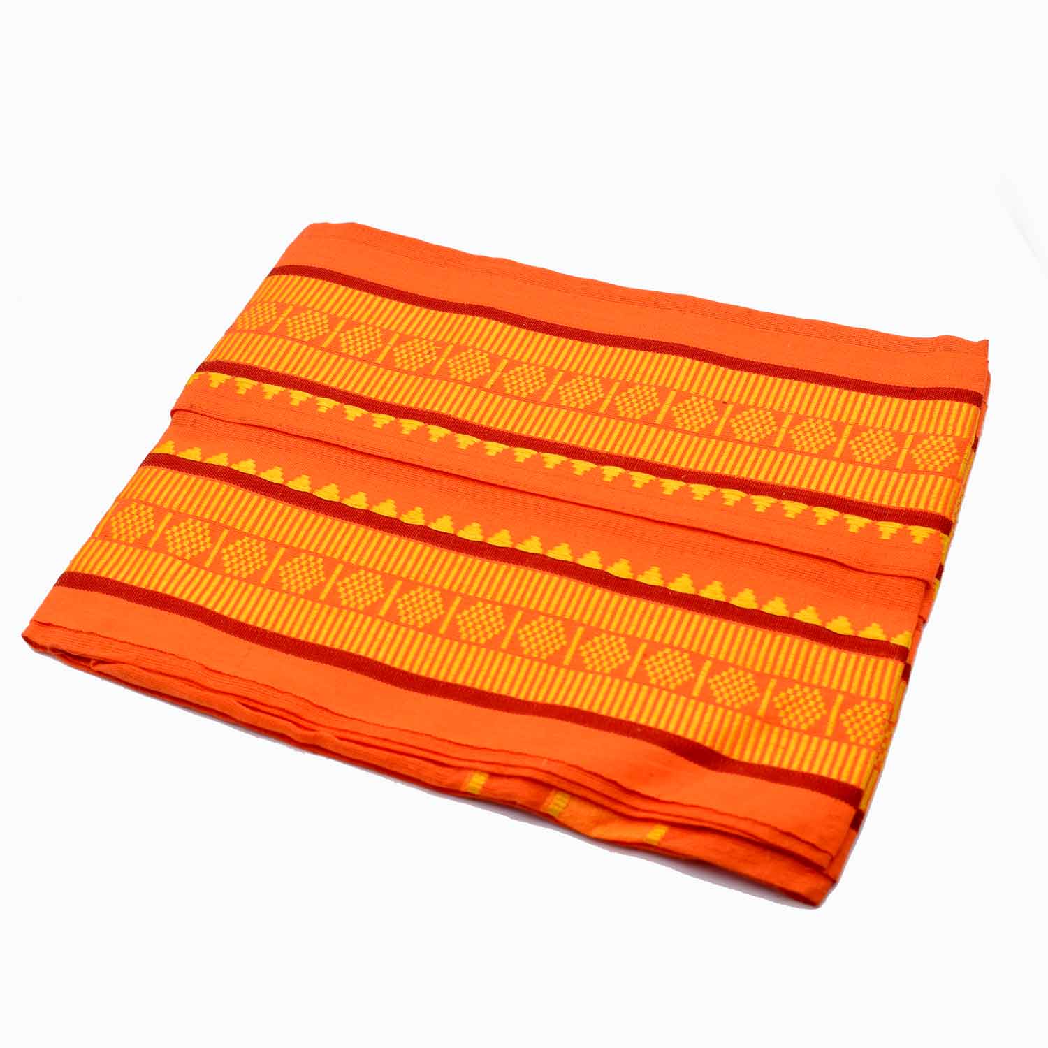 The Charming Saffron colored Towel made of pure cotton has red borders with golden cotton thread weaving.