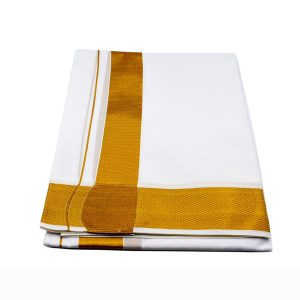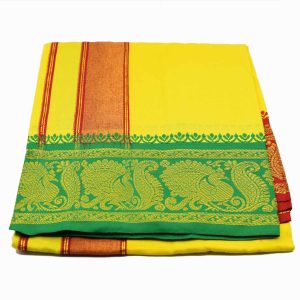 Especially woven by the artisans from interiors of Salem, Tamil Nadu. Dhoti also known as Vesti is traditional wear worn by men by wrapping it around waist during festivals, puja or religious ceremonies. Cotton helps absorb the positive energies in the surrounding, and also creates a shield which protects you from negative energies that cause distress or distraction of mind.