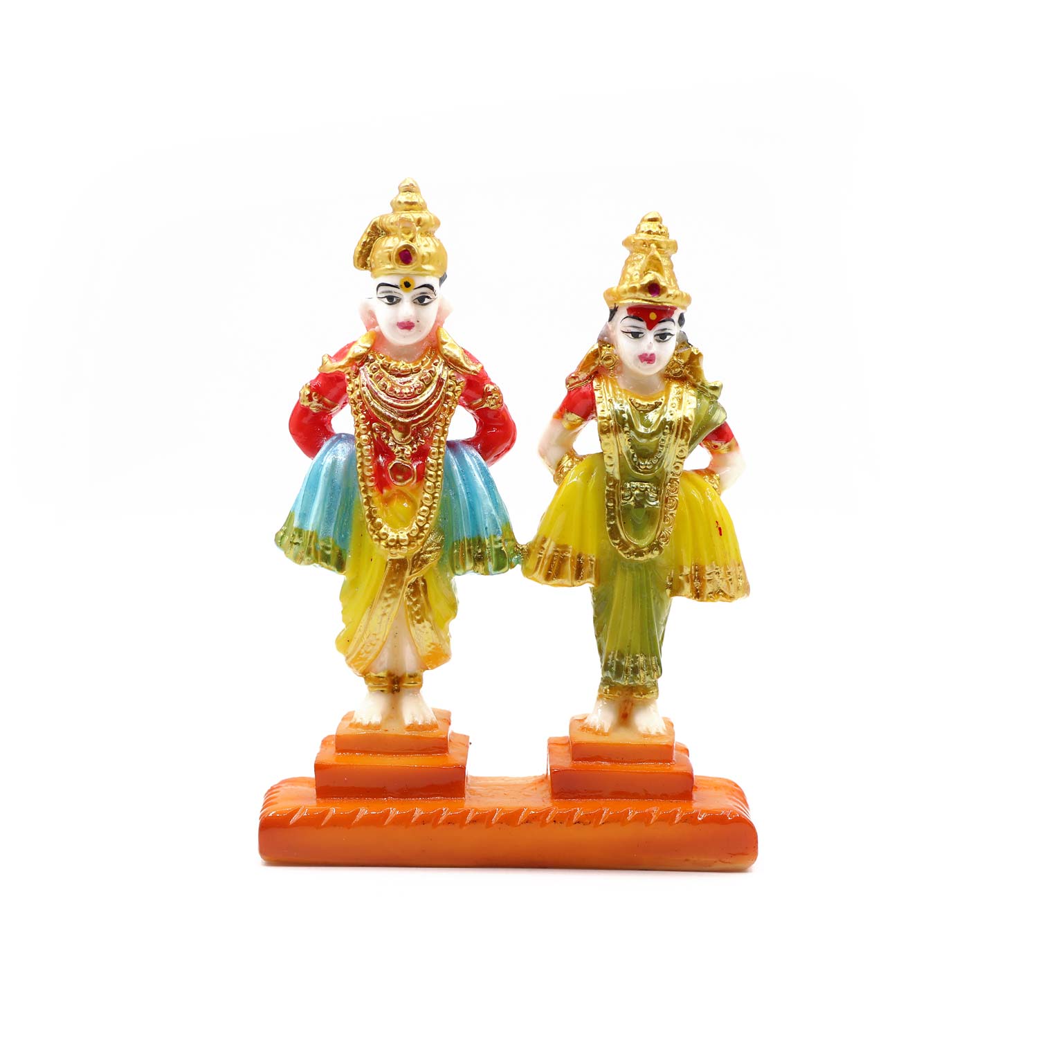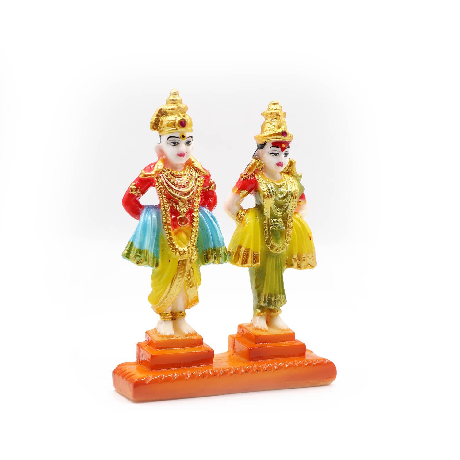 Lord Vittal standing along with his consort Devi Rukmini on a dais is made in fibre and beautifully designed with vibrant colors to bring a divine aura and the blessings of Lord Vitthal and Goddess Rukmani to your home. You may place the idol in your puja room, living area, work or study desk for blessings of harmony, bliss fortune, prosperity and spiritual power.